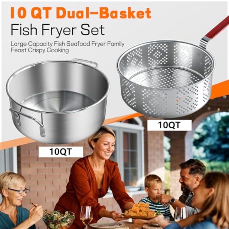 10QT Outdoor Fish Fryer Kit | Heavy-Duty Aluminum Pot and Basket Fixing Rod and Thermometer for Cooking Chicken Wings, Seafood, French Fries