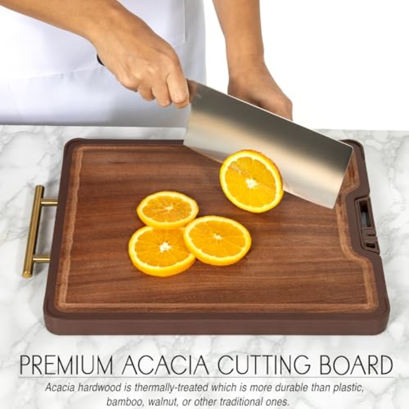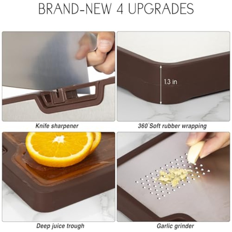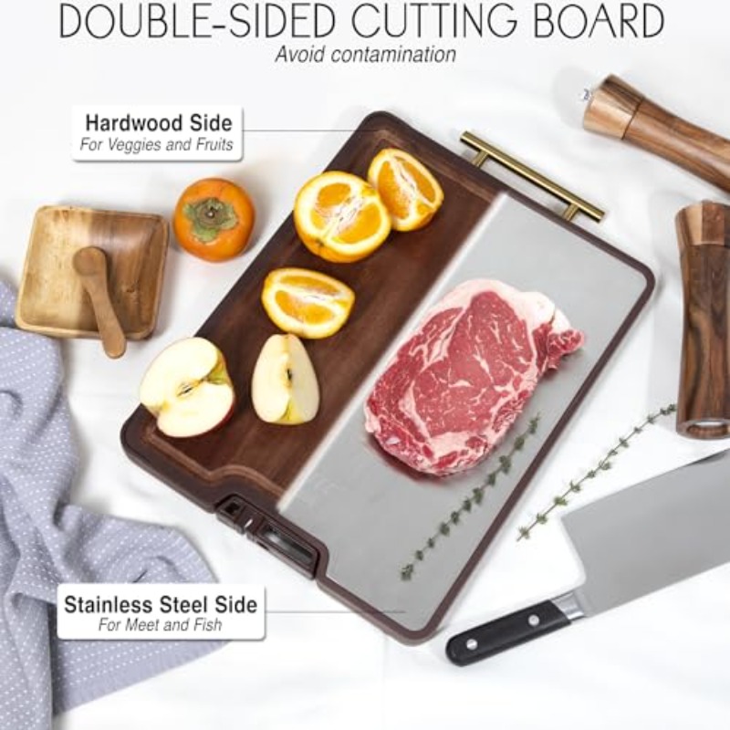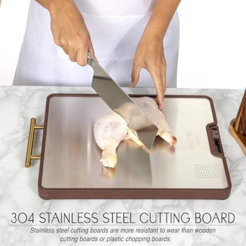 Titanium Stainless Steel Cutting Board with Knife Sharpener - Heavy-Duty Metal Kitchen Board, Non-Toxic & Dishwasher Safe, Golden Handle & Non-Slip Rubber Padded Base, Suitable for Chef, Butcher, Meal - 15"x11"